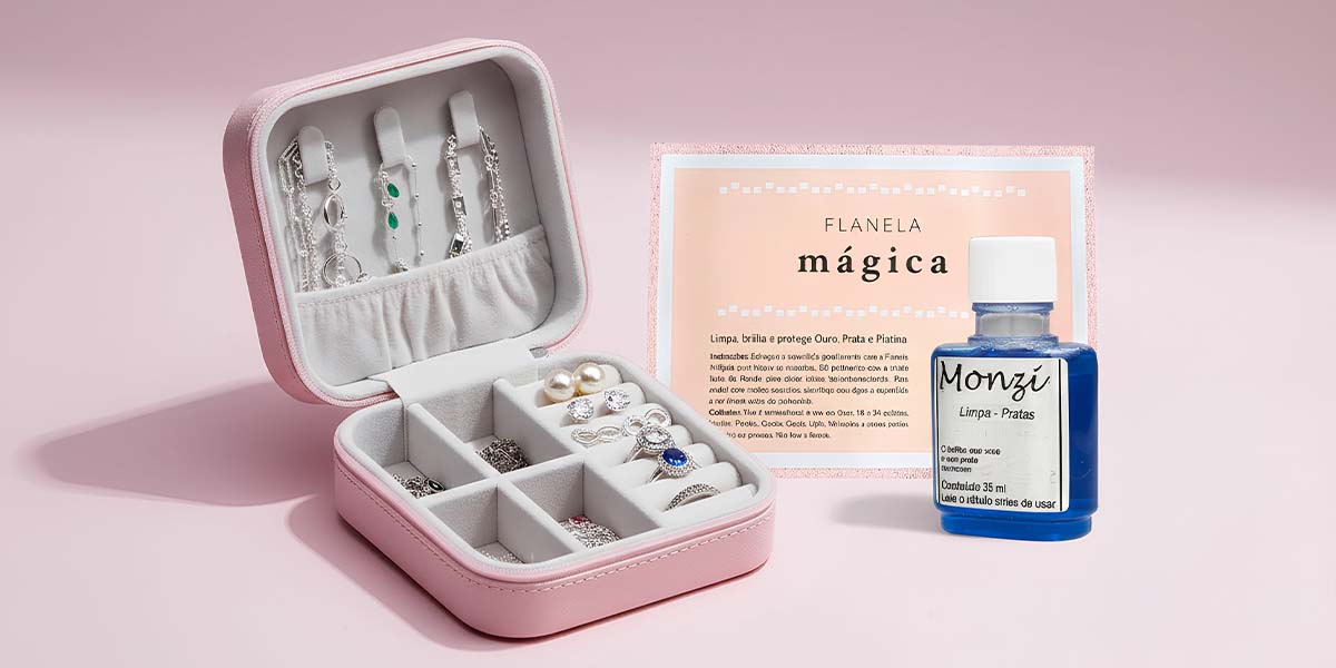 - Se a peça ficou “apagada”, faça uma limpeza leve em casa com o Kit Limpeza Flanela Mágica e Monzi Limpa Pratas.