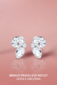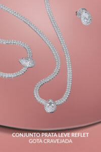 Nos brincos e gargantilhas, isso aparece de forma sutil, principalmente nas combinações com zircônia, que refletem a luz sem exagero.