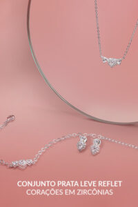 Nos modelos da coleção, o coração aparece em tamanhos menores, muitas vezes combinado com zircônias, o que deixa tudo mais delicado e fácil de usar no dia a dia.